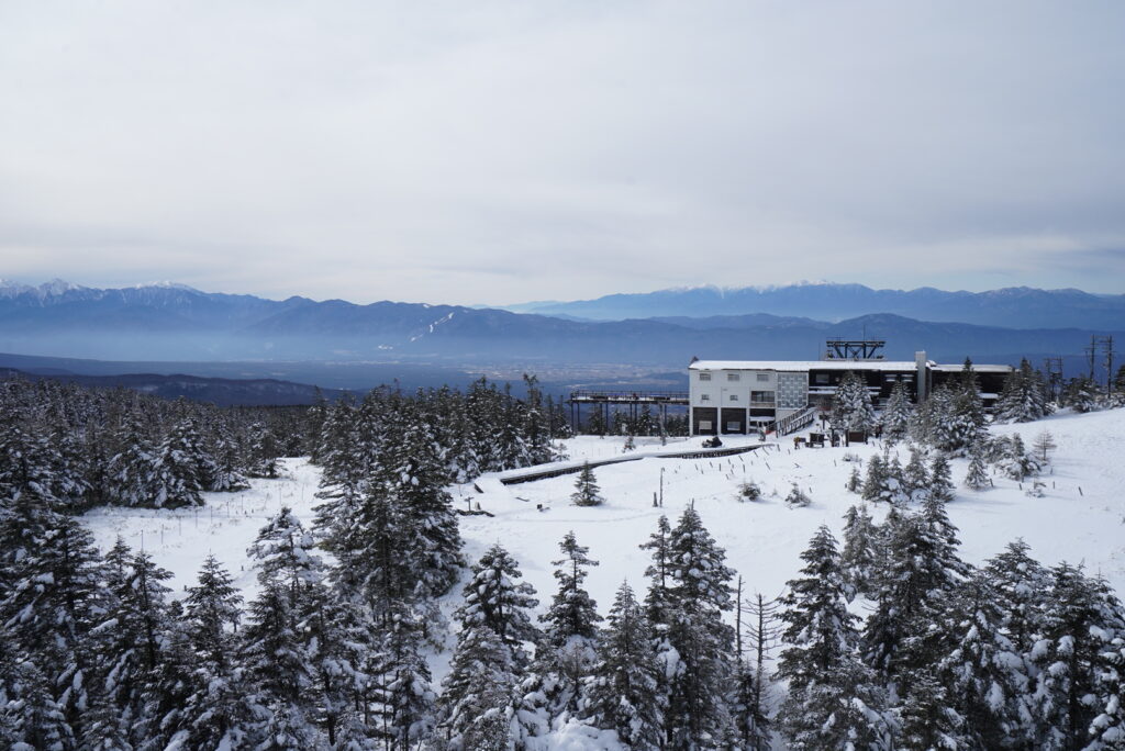 振り返ると、ロープウェイ乗り場と、その奥に茅野の街並みが一望できます。