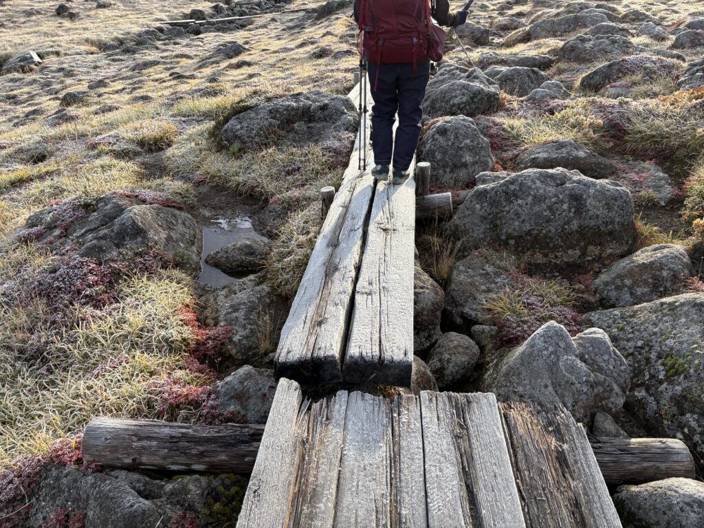 雲ノ平山荘を出発しておよそ1時間、やっと木道地帯を突破しました。