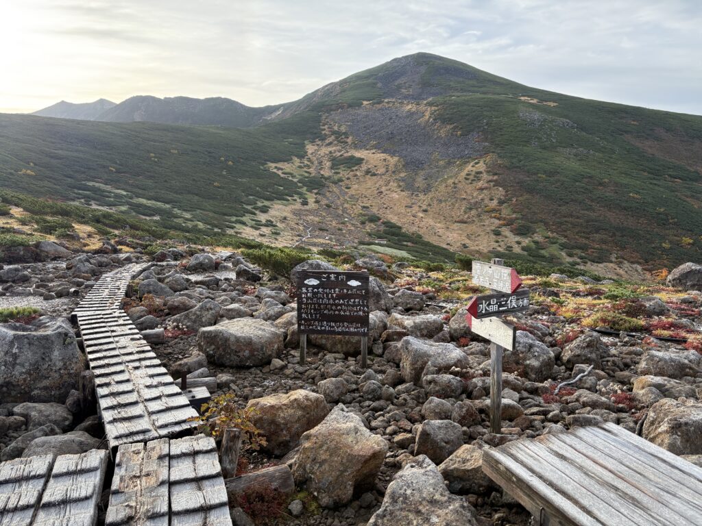 滑る木道に苦戦しながら、まずは祖父岳を目指します。