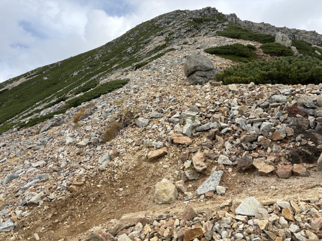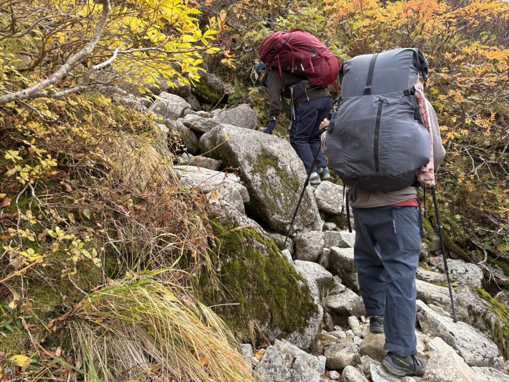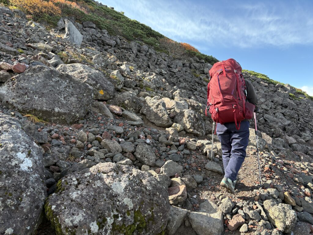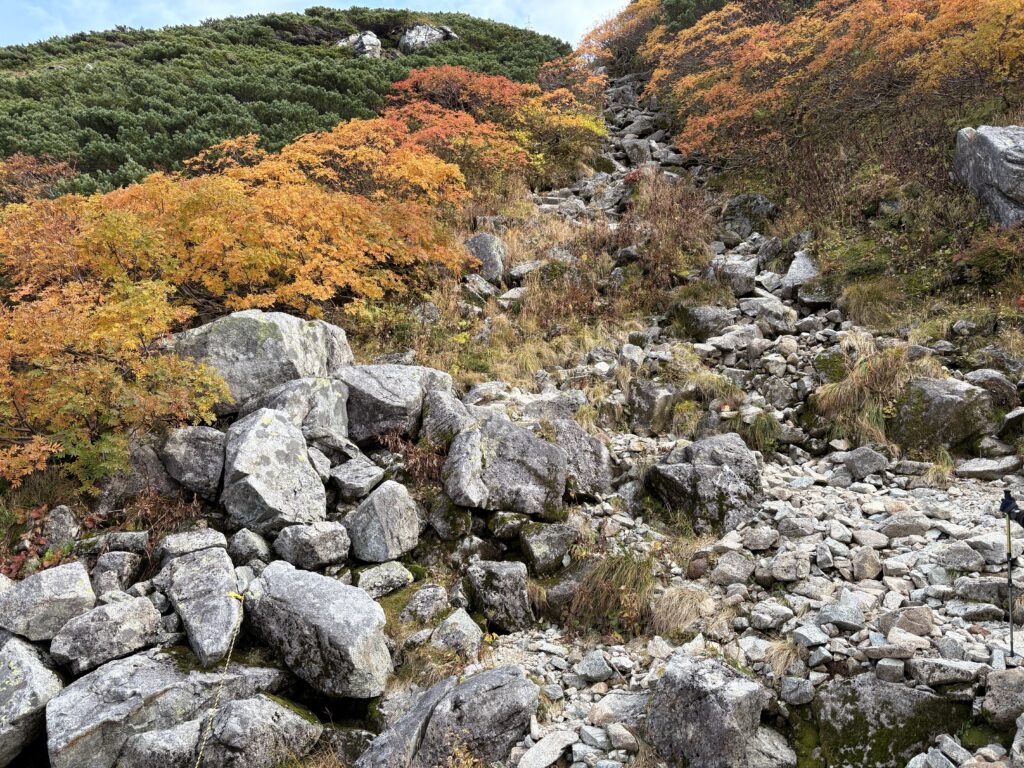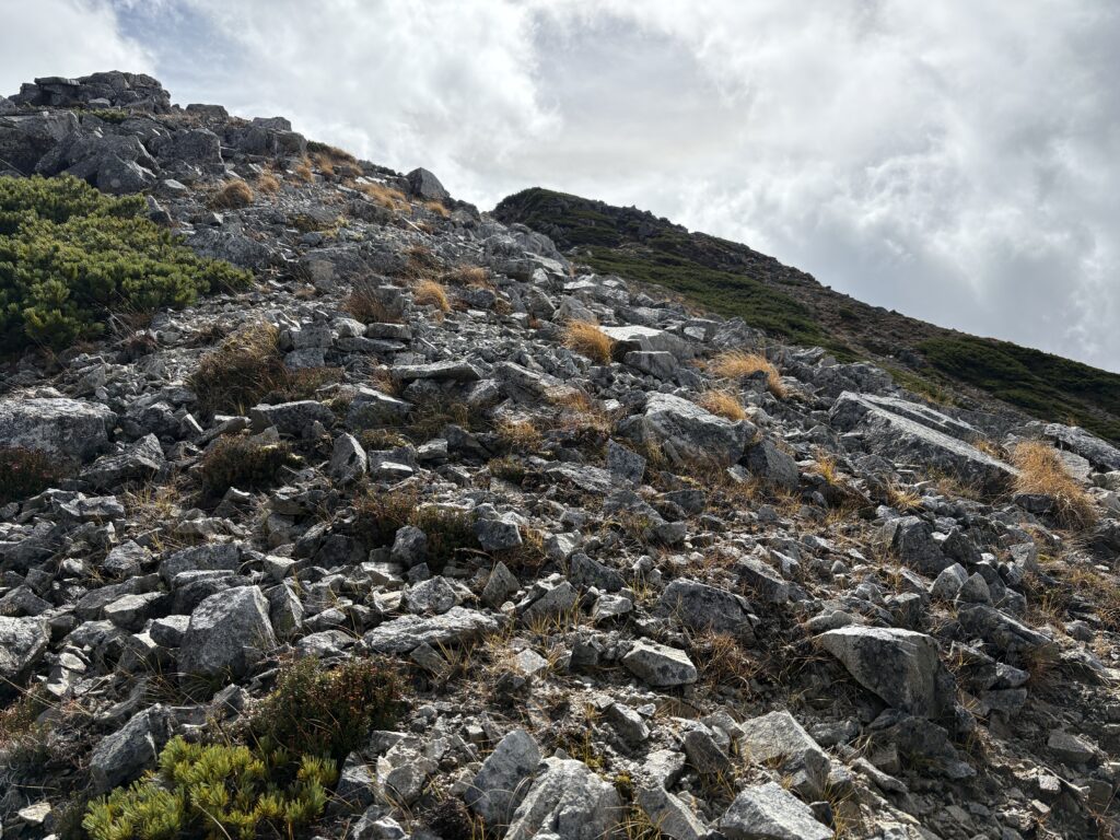 足元は、ガレ場が中心ですが大きな岩が転がっている場面も目立ちます。