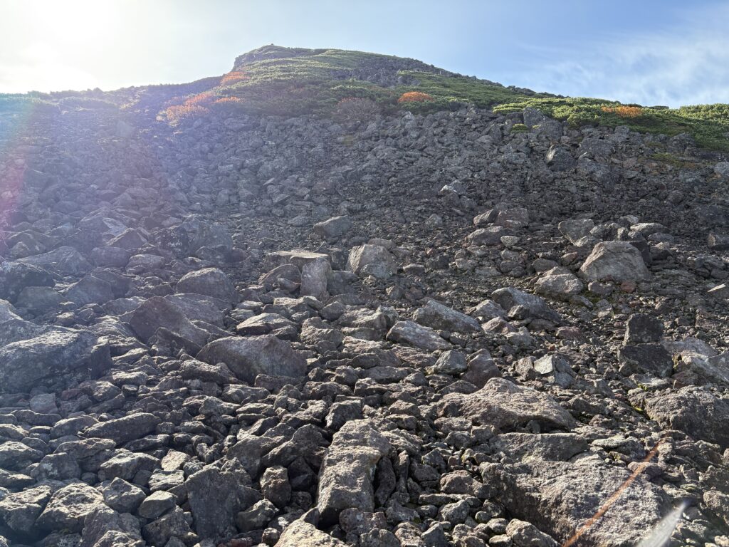 上を見上げると祖父岳への急登が視界を覆いつくしており、目の前のガレ場はルートが分かりづらくなっています。
