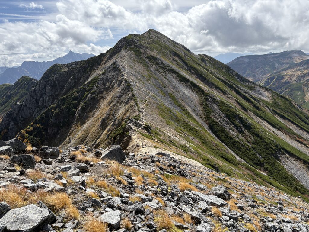 向こうに見える面白い形のピークが、ワリモ岳の山頂です。