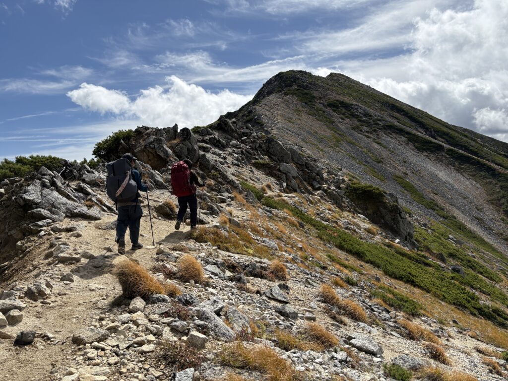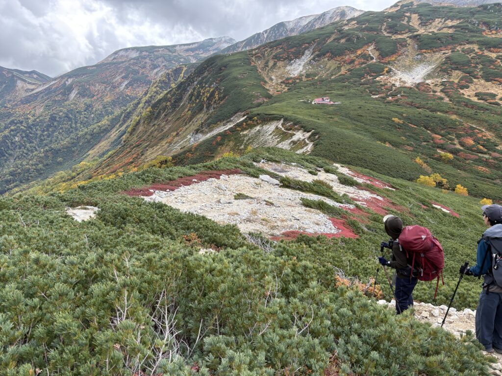 ここからは、見ての通り急な斜面を乗り越えて、ワリモ岳や鷲羽岳に続く稜線へ向かいます。